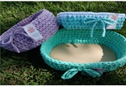 HERMOSAS CANASTAS COMETIQUERAS TEJIDAS A MANO EN LICRA DIFERENTES COLORES Y TAMAÑOS REALIZADA POR MUJER RIONEGRANA